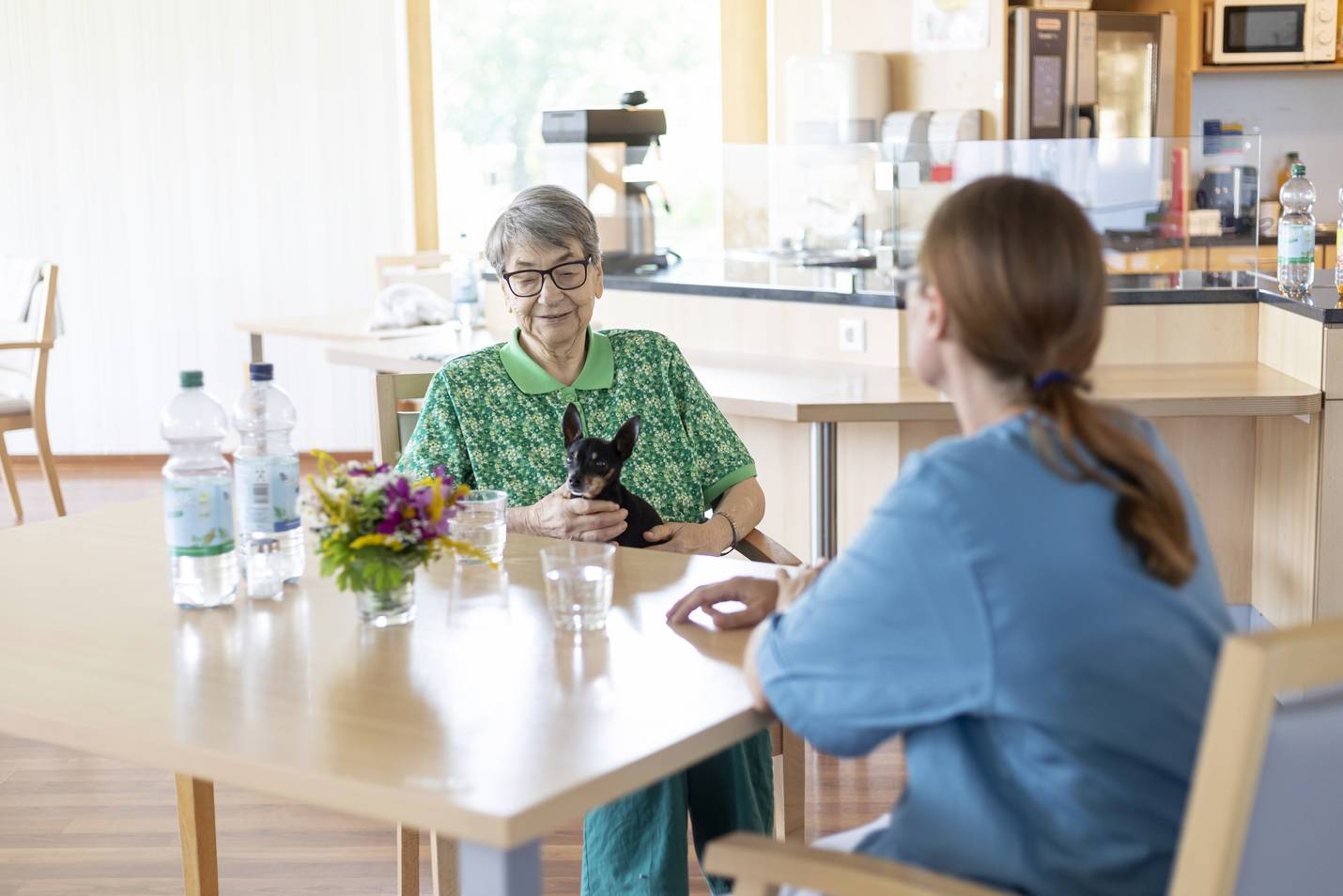 - Hauseigene Küche: Eine ausgewogene Ernährung ist für uns selbstverständlich. Wir kochen täglich frisch. Neben unseren Hauptmahlzeiten sind Zwischenmahlzeiten auf Wunsch unserer Bewohner*innen rund um die Uhr möglich.