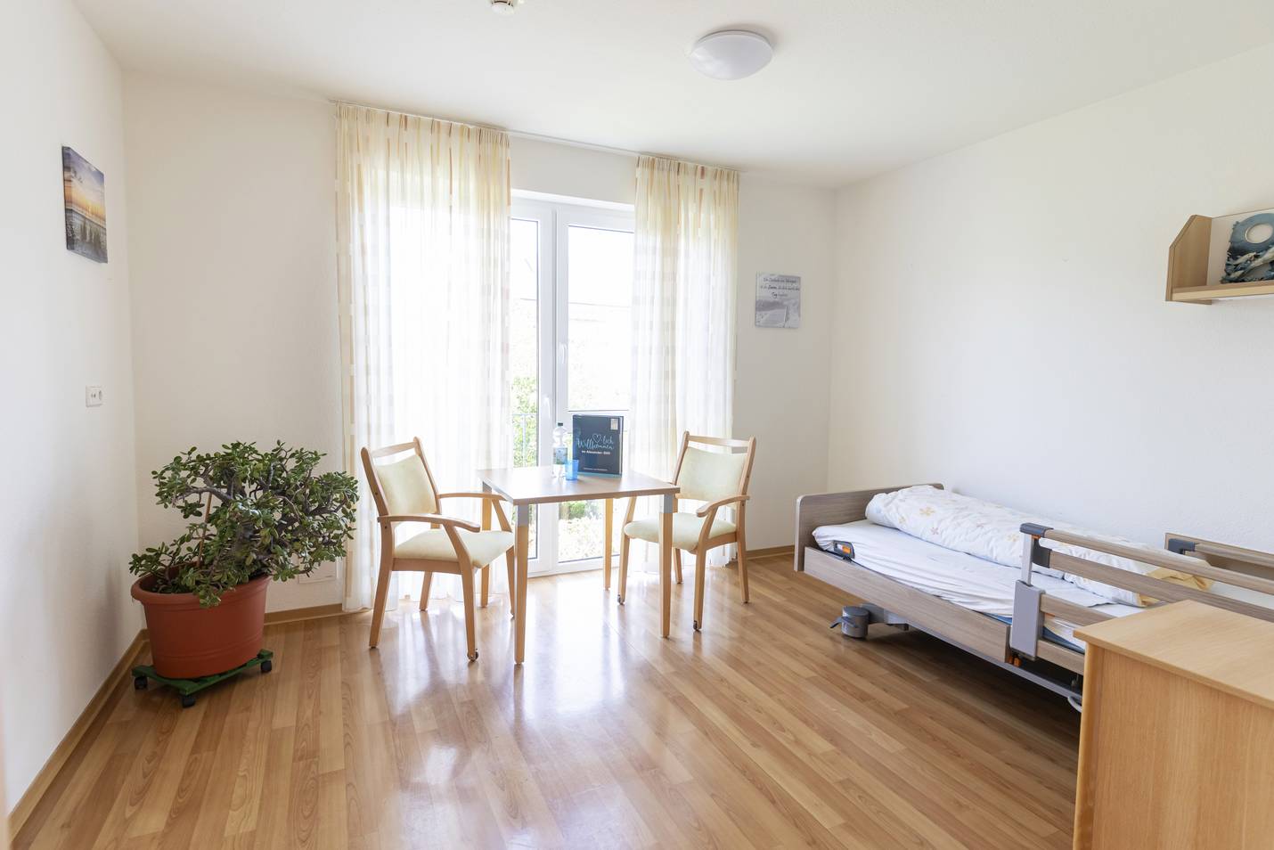 - Zimmerausstattung: Bad, Pflegebett, Nachttisch, Kleiderschrank, TV-Kommode, Tisch und Stühle, Telefon- und Kabel-TV-Anschluss und ein Hausnotruf.